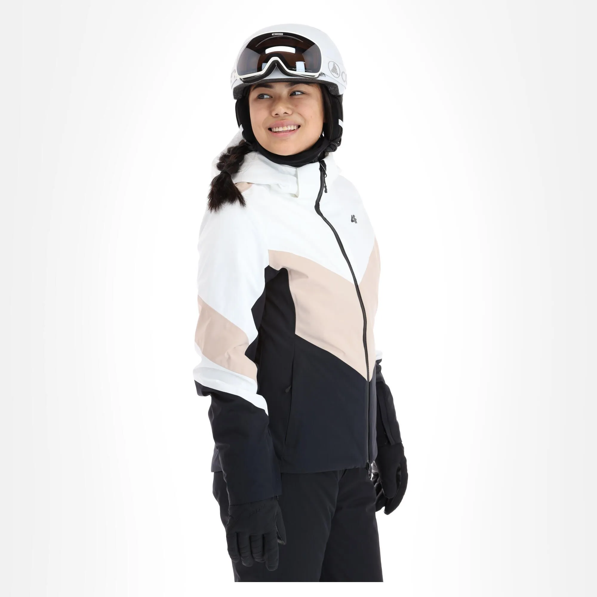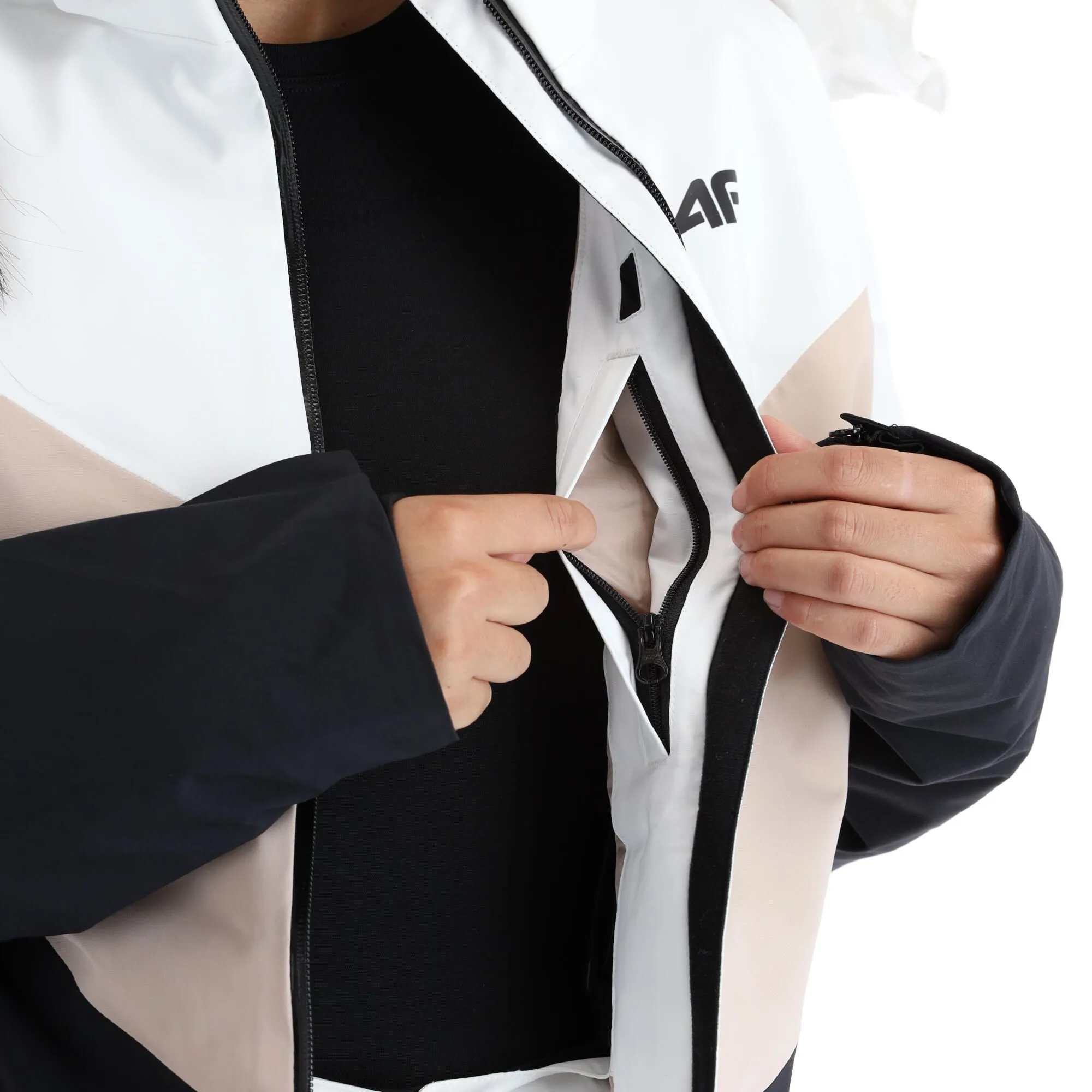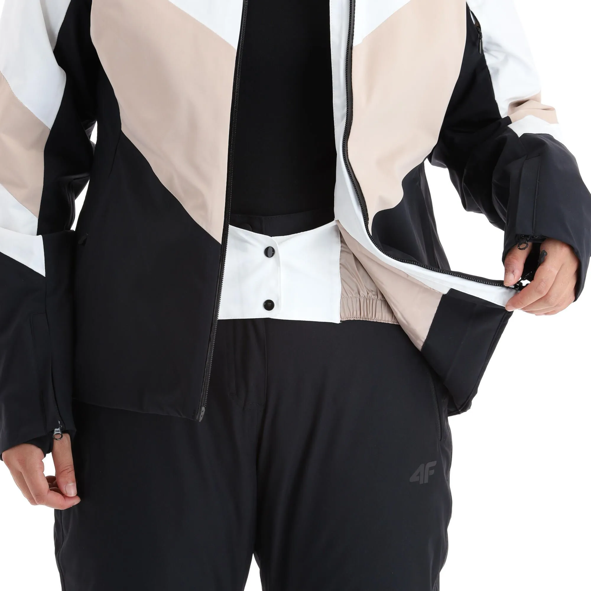 - Fermeture éclair étanche La grande fermeture éclair sur le devant de la veste de ski est hydrofuge.