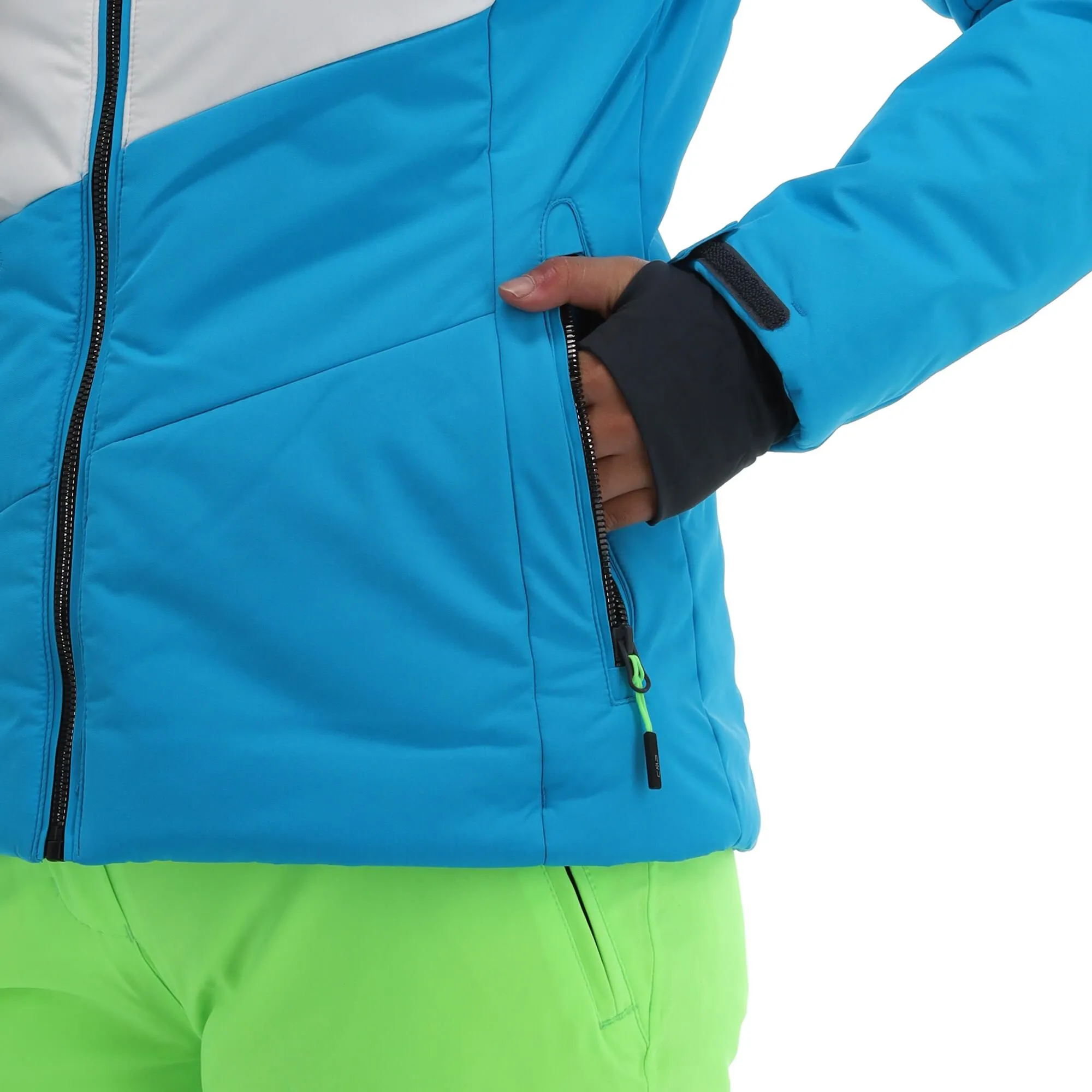 - Pochette pour le forfait de ski La veste de ski est munie d’une pochette où vous pouvez mettre votre forfait de ski, pour éviter de le sortir sur les remontées mécaniques.