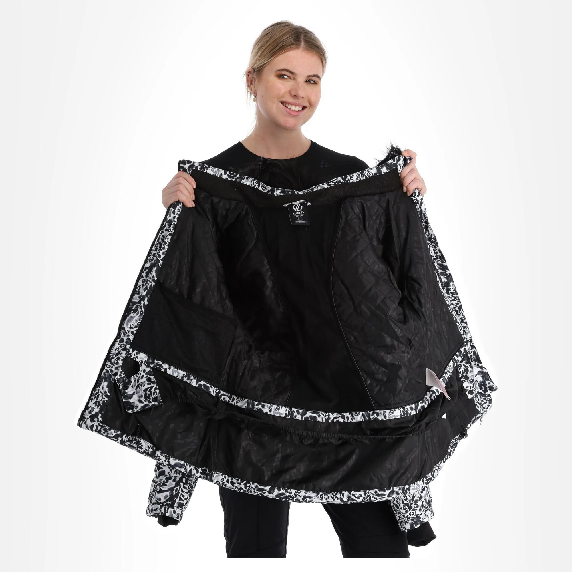 - Col en fausse fourrure La veste de ski a un col avec de la fausse fourrure.