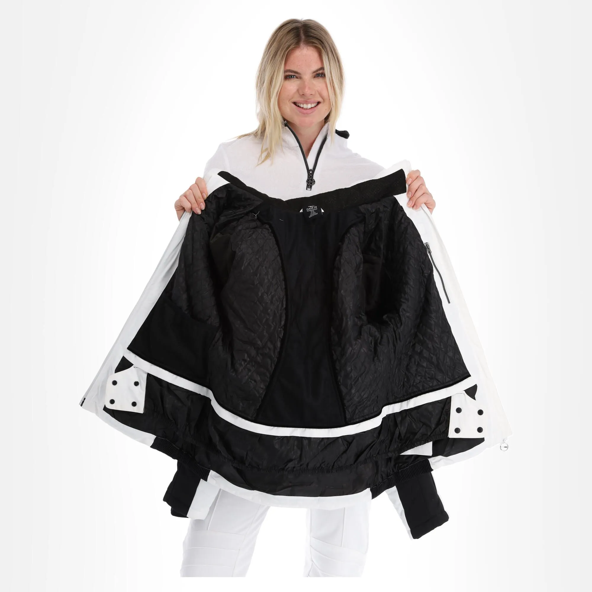 - Jupe pare-neige amovible La veste de ski est munie en bas d’une bande élastique amovible. Cela empêche la neige de pénétrer dans votre veste de ski par en-dessous, mais vous pouvez également la retirer si besoin.