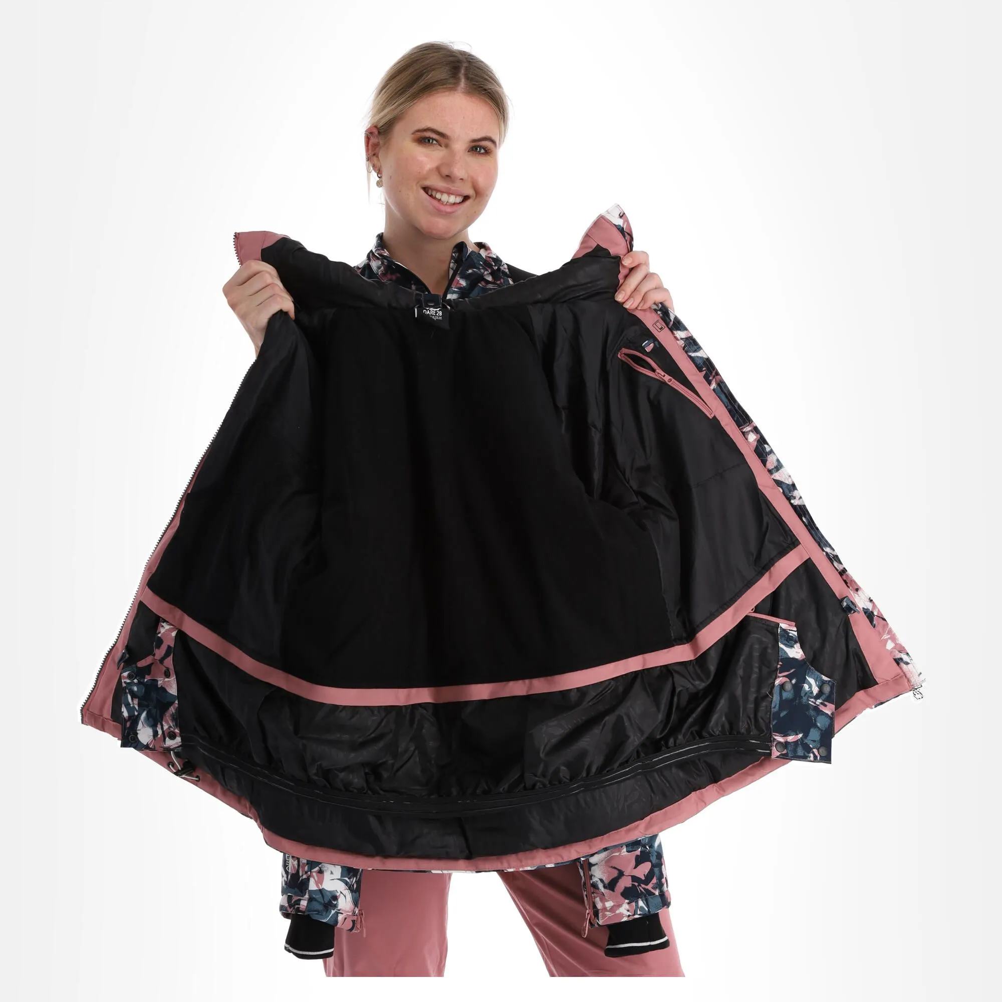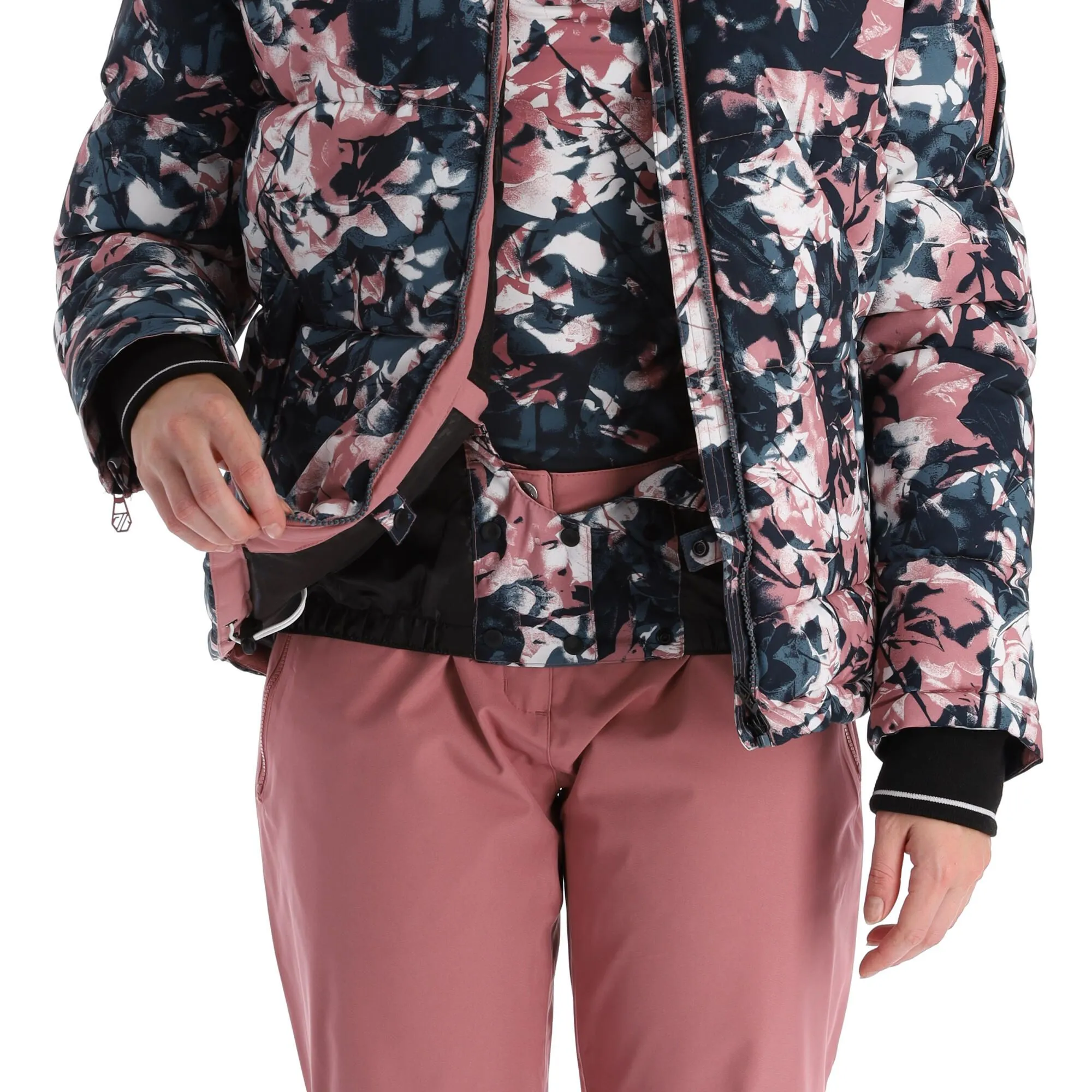 - Jupe pare-neige amovible La veste de ski est munie en bas d’une bande élastique amovible. Cela empêche la neige de pénétrer dans votre veste de ski par en-dessous, mais vous pouvez également la retirer si besoin.