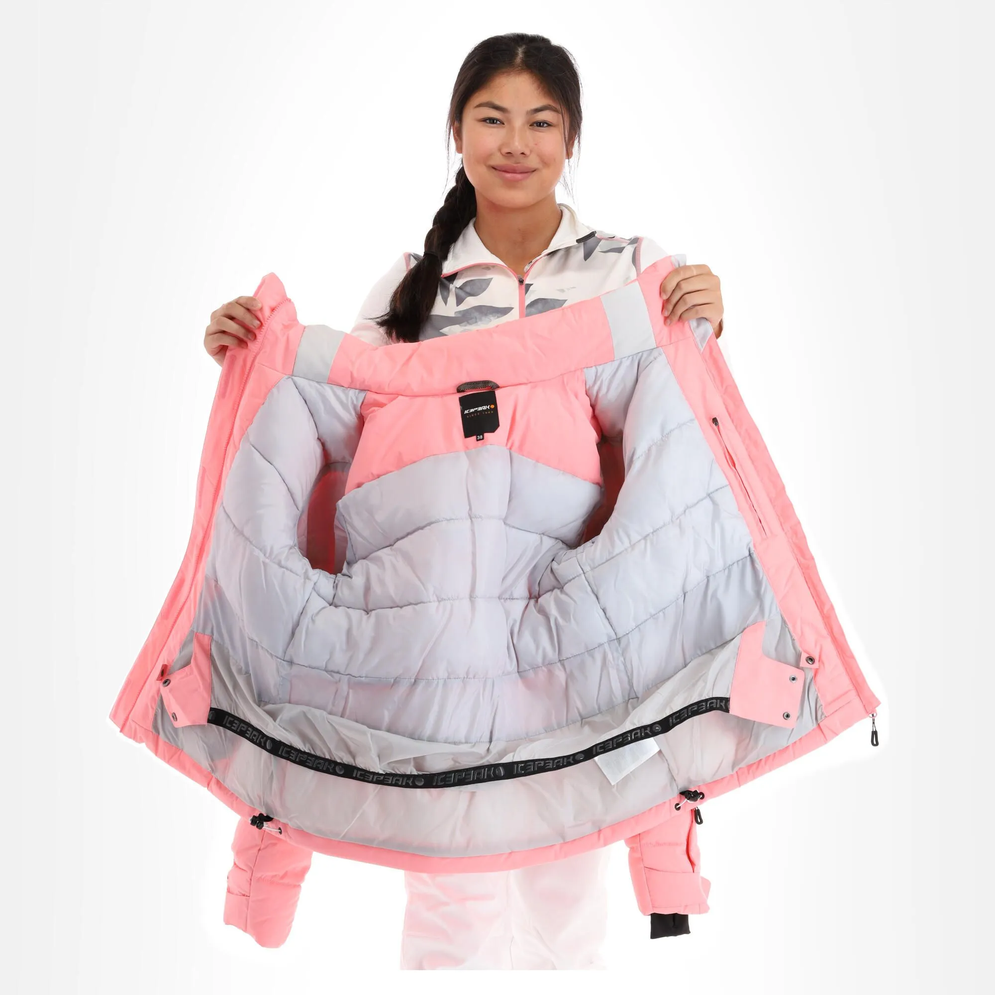 - Jupe pare-neige fixe La veste de ski est munie d’une bande élastique en bas, de sorte que la neige ne peut pas pénétrer par en-dessous.