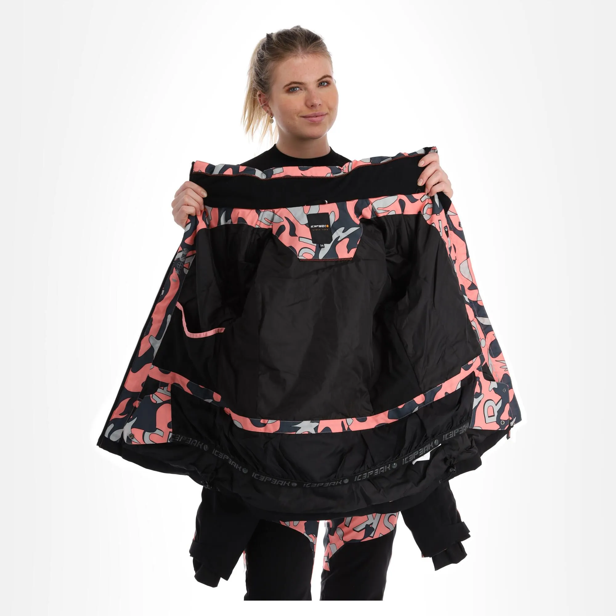 - Ourlet réglable La veste de ski a un ourlet réglable, pour permettre de la fermer correctement en bas.