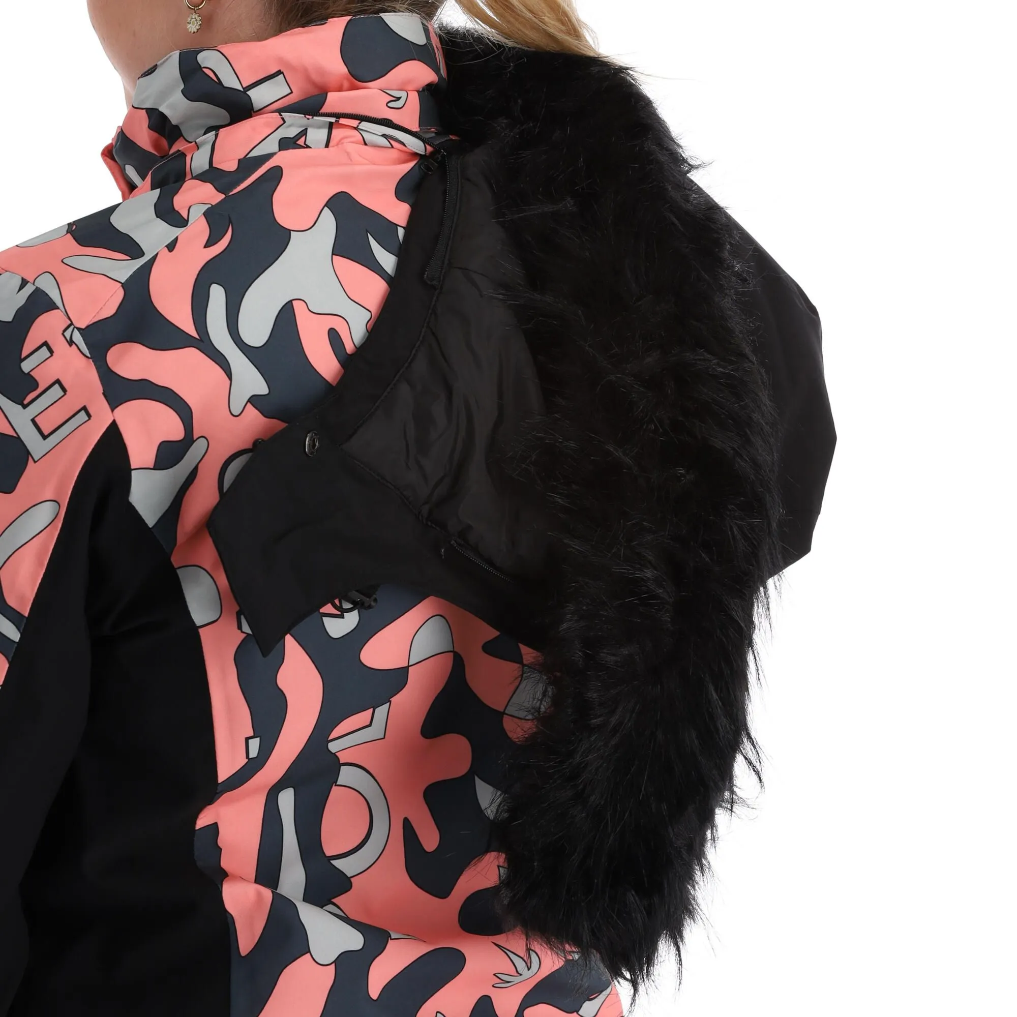 - Col en fausse fourrure La veste de ski a un col avec de la fausse fourrure.