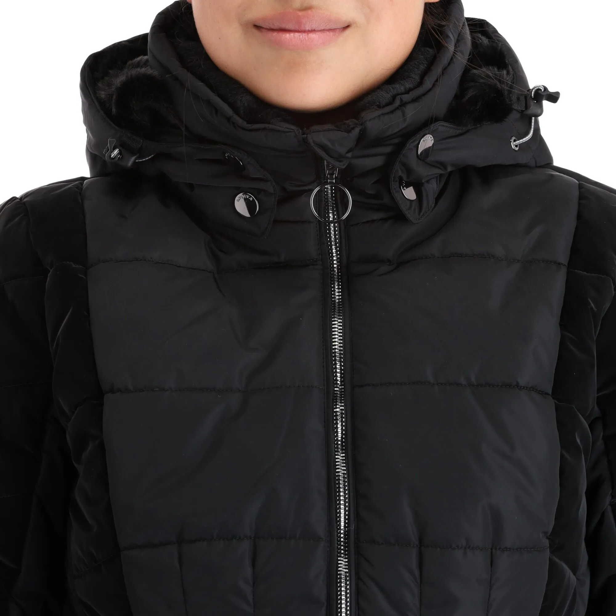 - Col en fausse fourrure La veste de ski a un col avec de la fausse fourrure.