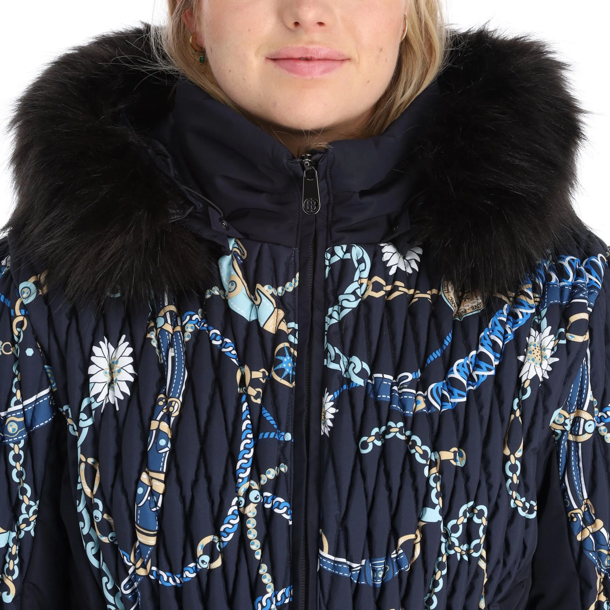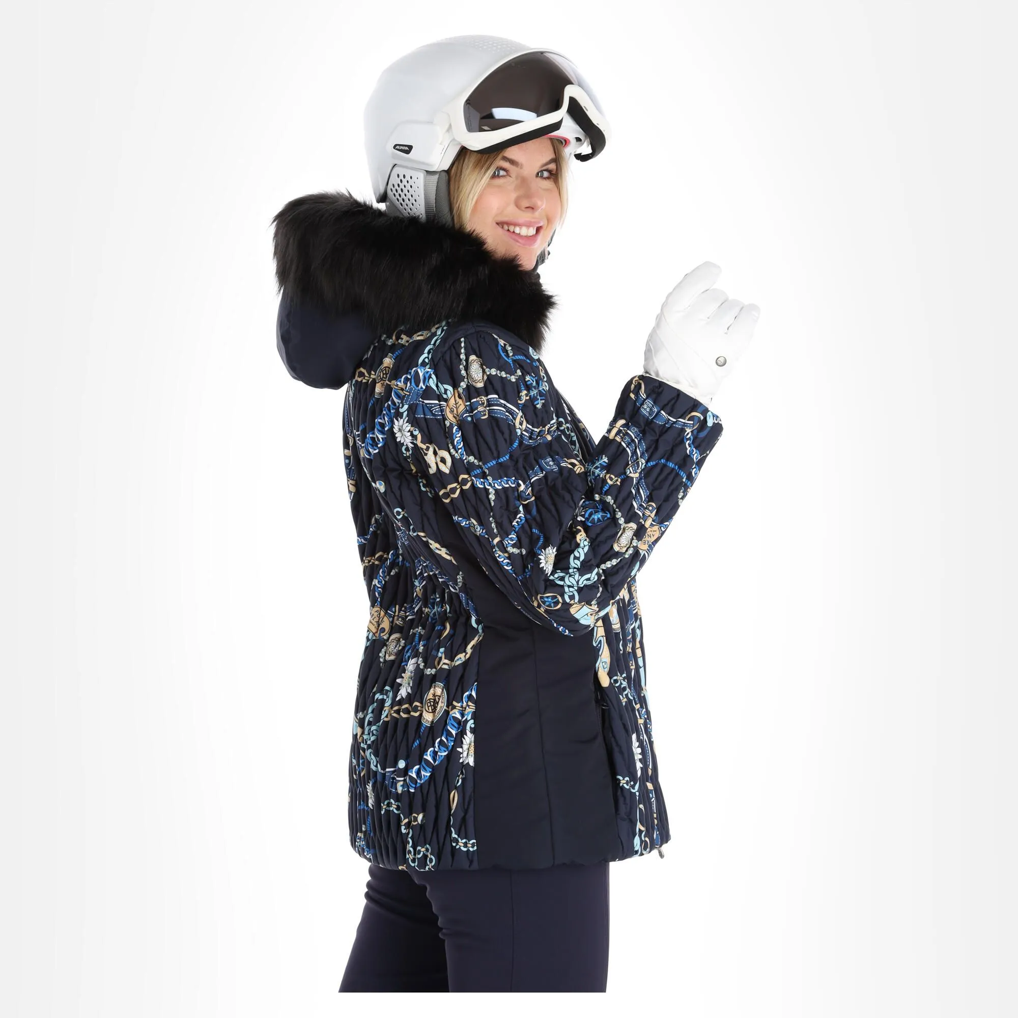 - Col en fausse fourrure La veste de ski a un col avec de la fausse fourrure.