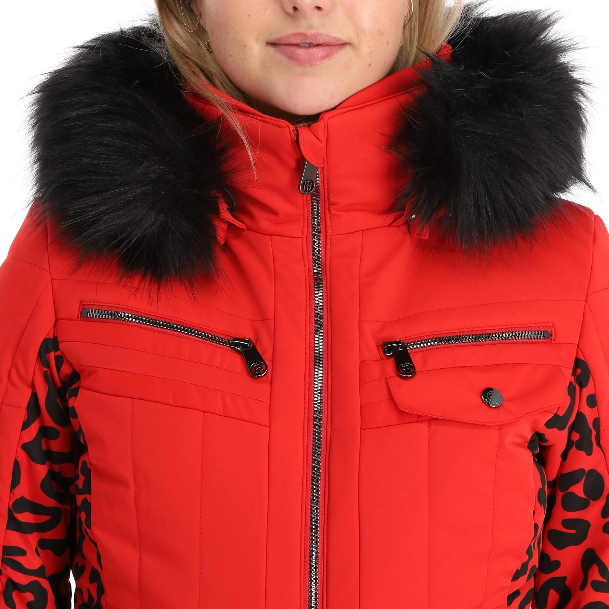 - Col en fausse fourrure La veste de ski a un col avec de la fausse fourrure.