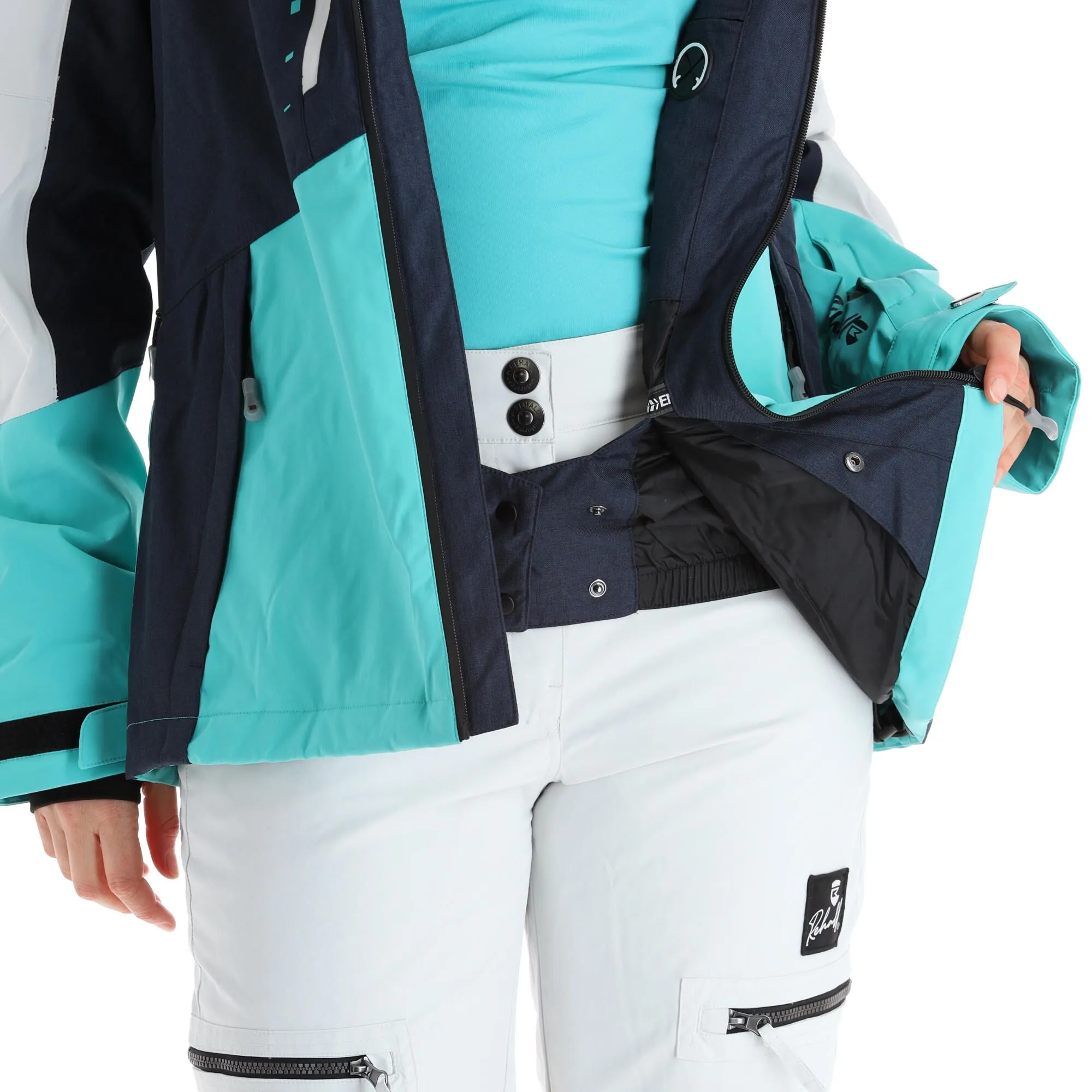 - Fermeture éclair étanche La grande fermeture éclair sur le devant de la veste de ski est hydrofuge.