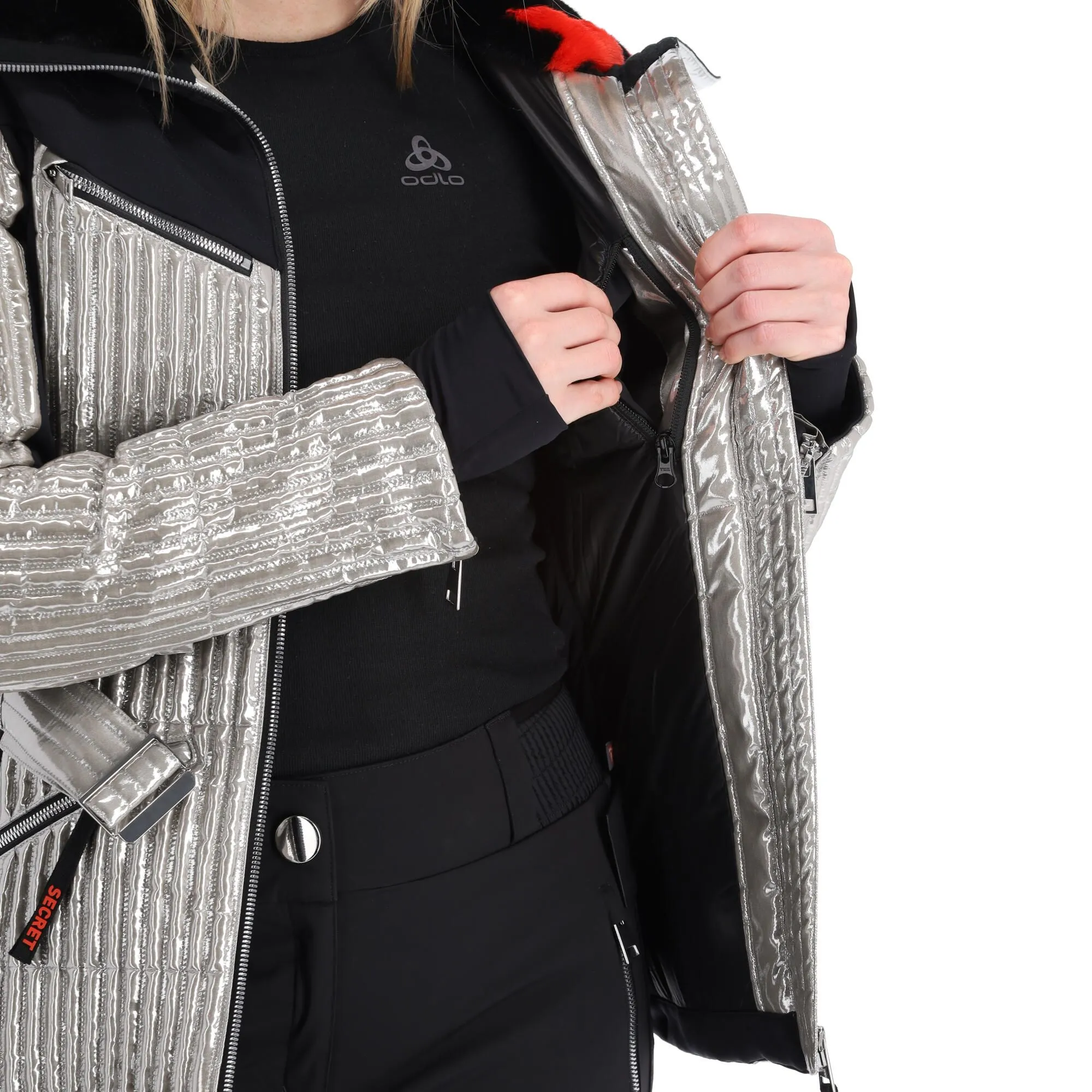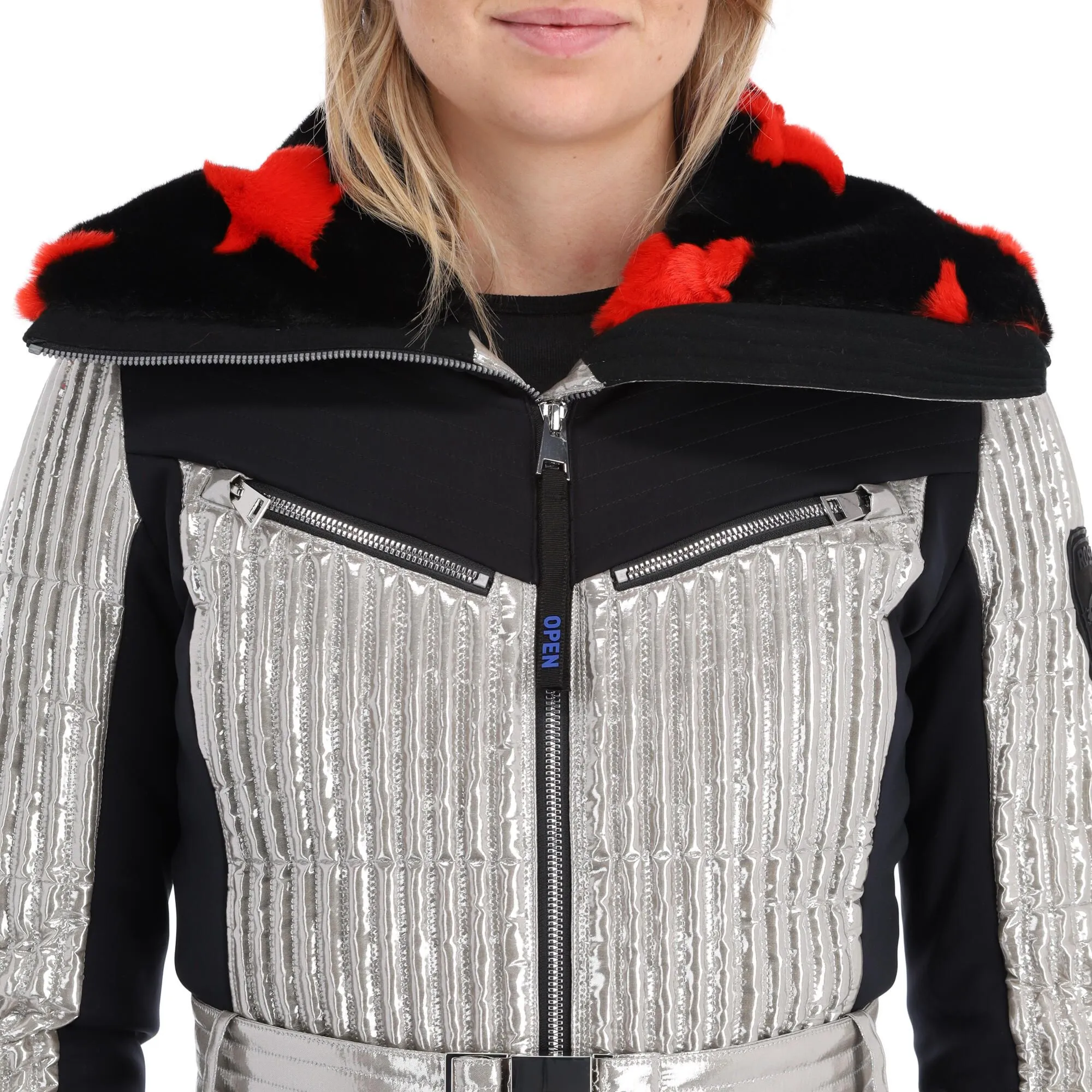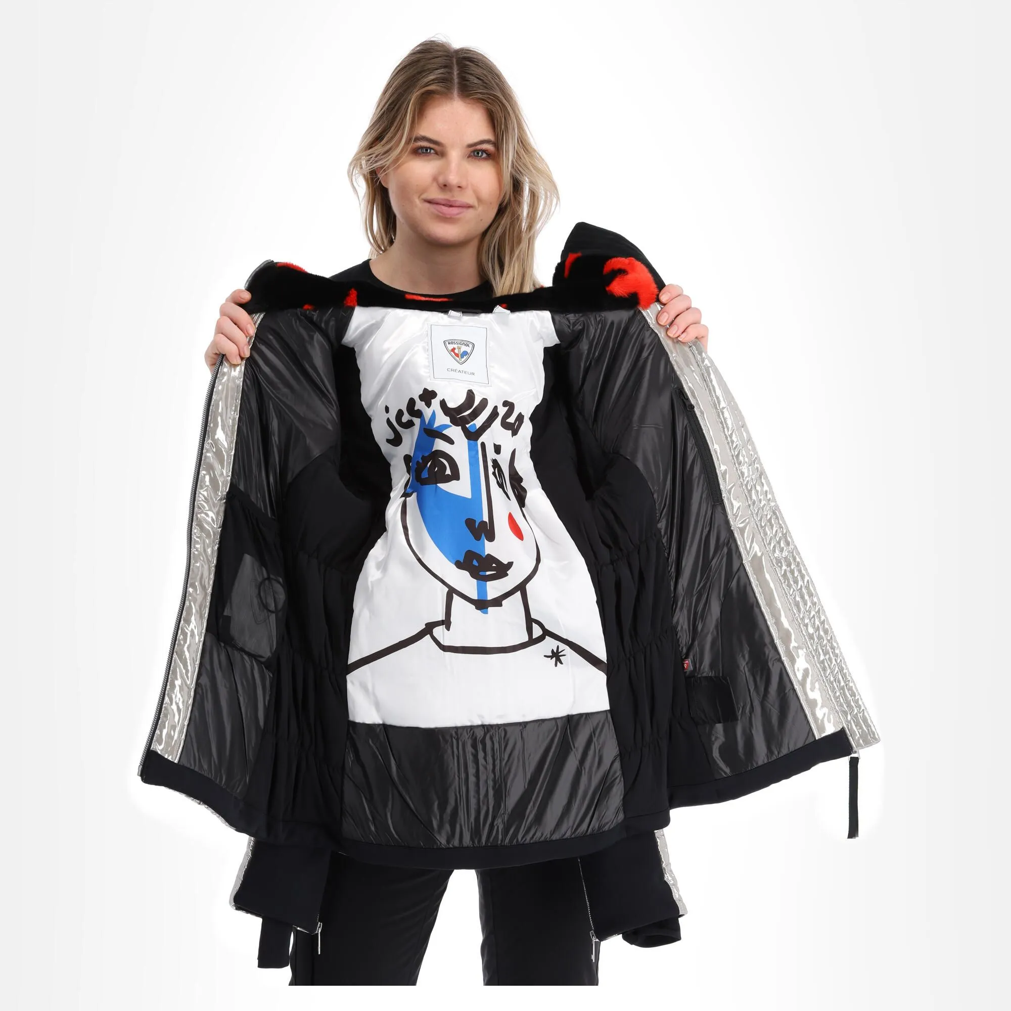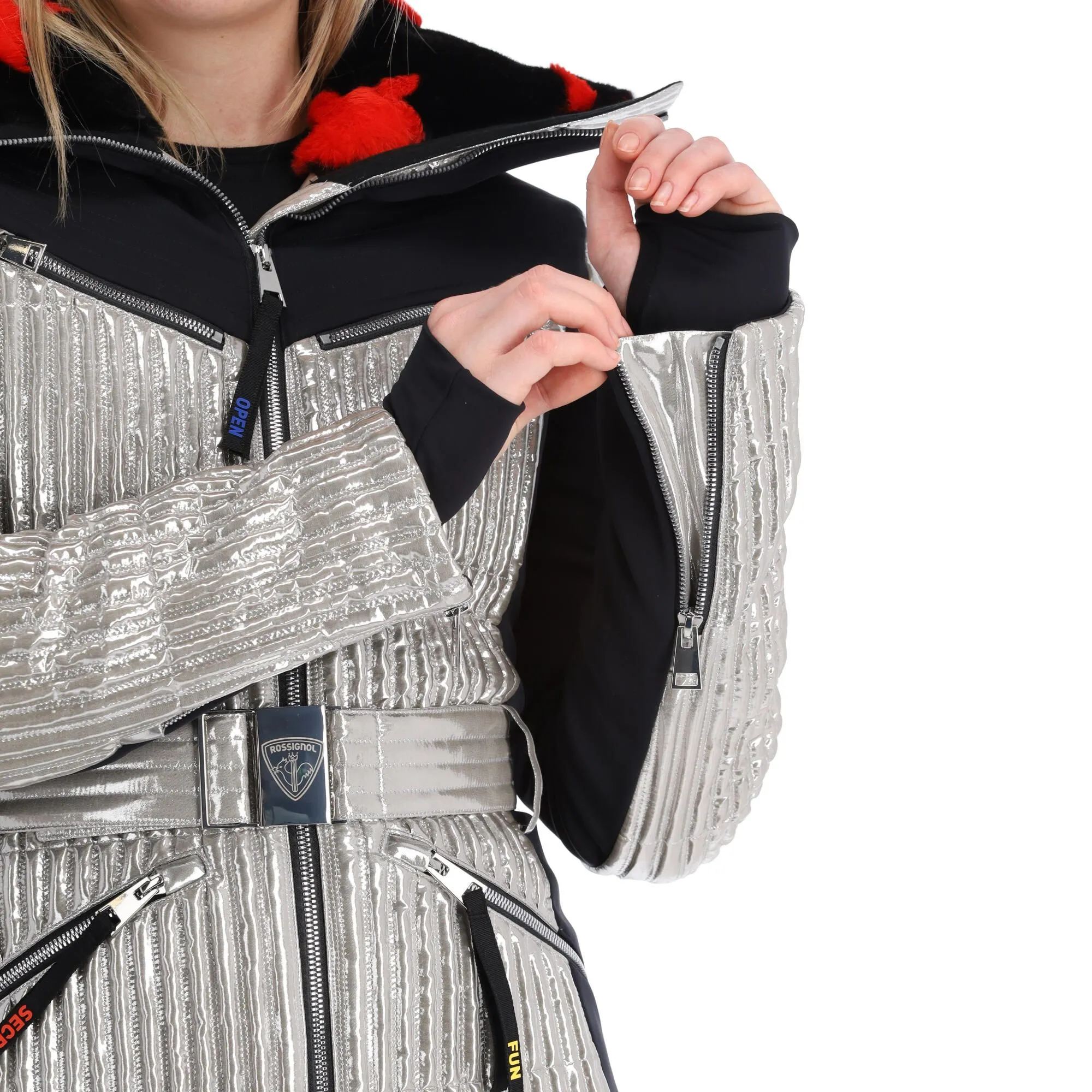 The Maddy-Star by Rossignol combines performance and fashion. Redesigned in honor of the 20th anniversary of the famous collaboration between Jean-Charles de Castelbajac and Rossignol, the Maddy Star Silver women’s jacket showcases a slim silhouette accented by an oversized star collar. Breathable, lightweight insulation keeps out cold winds, and the water-repellent finish repels light snow to keep you dry. Stretch side panels allow the jacket to move with you for natural freedom of movement. Multiple zippered pockets keep your ski pass and other essentials close. This fashionable jacket will have you shining down the slopes.