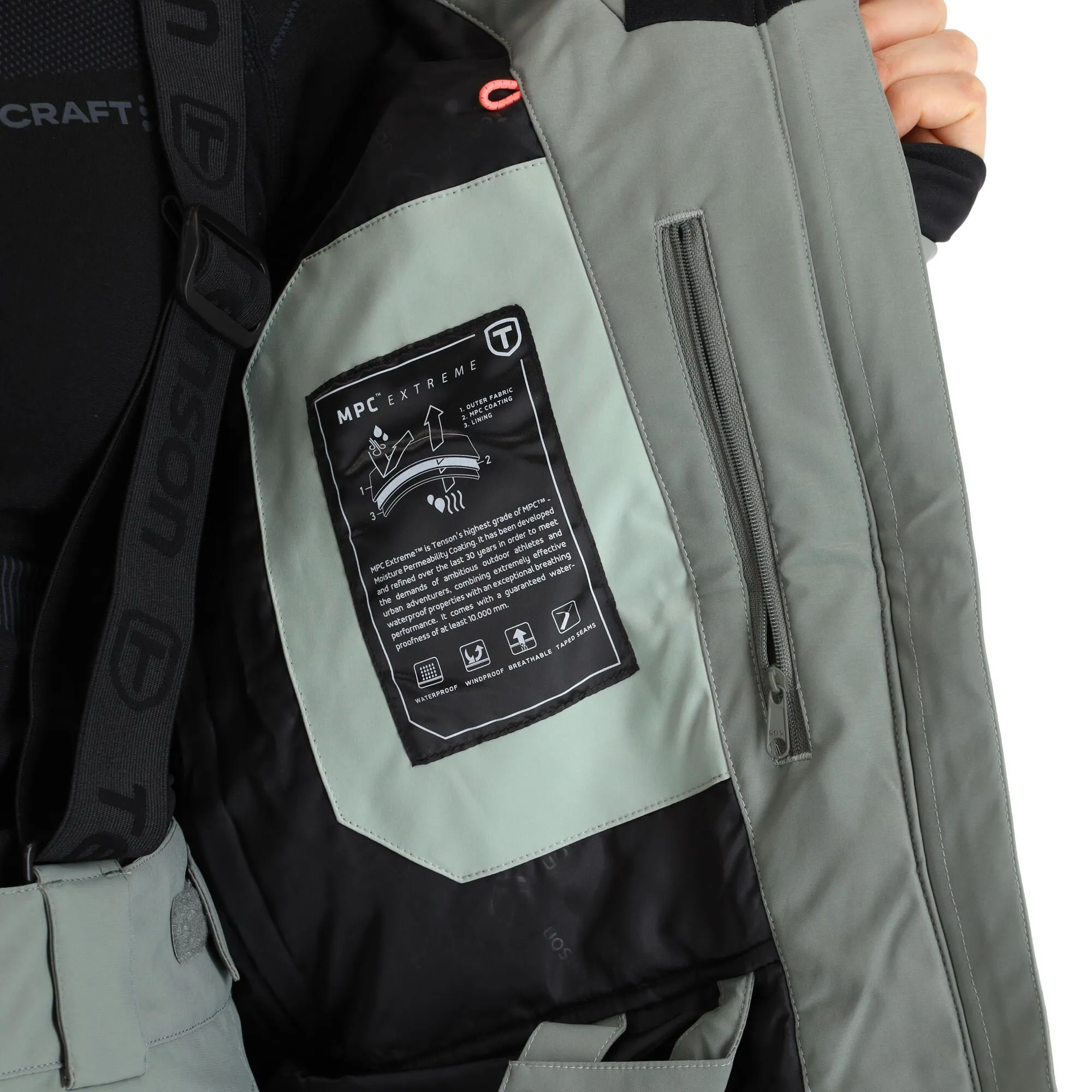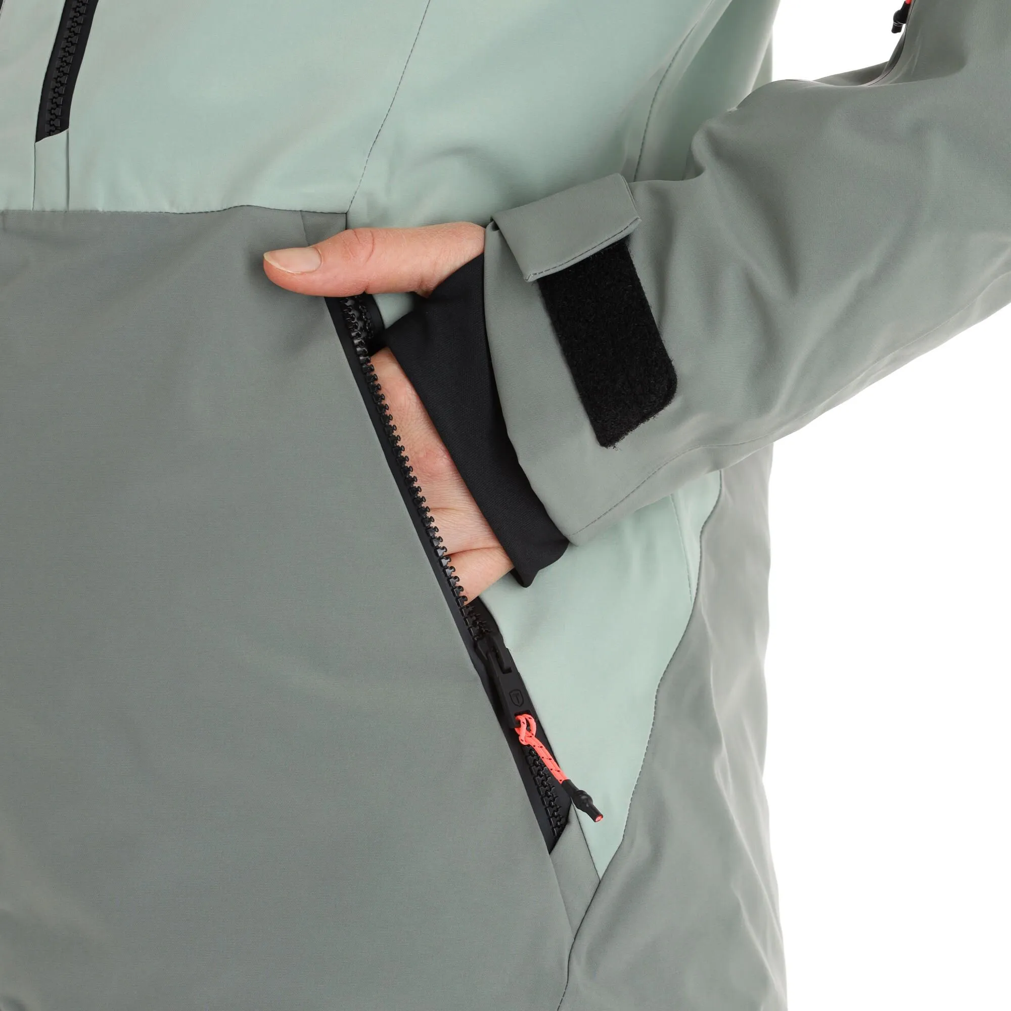 - Pochette verticale poitrine Sur le devant de la veste de ski se trouve une poche supplémentaire (cachée) sur la poitrine, à côté de la grande fermeture éclair.